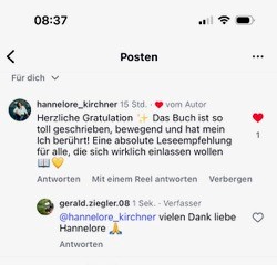 "Lieber Gerald, ich habe dein Buch gestern noch verschlungen und ich finde es sehr berührend geschrieben. Ich habe mich so gut hineindenken können und dennoch ist es mit Sicherheit nur annähernd das, was du dort erlebt hast. Vielen Dank schon jetzt fürs Teilhaben lassen."